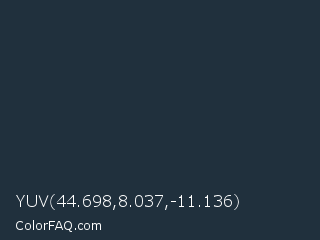 YUV 44.698,8.037,-11.136 Color is a very dark blue color and the nearest color is Yankees Blue #1c2841. Hex code #20303d and RGB value is rgb(32,48,61). In RGB color space, this color is composed of 13% red, 19% green, 24% blue, In CMYK color space, this color is composed of 48% cyan, 21% magenta, 0% yellow , 76% black , In HSL color space, this color has a hue angle of 207° , 31% saturation and 18% lightness.