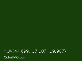 YUV 44.699,-17.107,-19.907 Color is a very dark green color and the nearest color is Palm Leaf #19330e. Hex code #163f0a and RGB value is rgb(22,63,10). In RGB color space, this color is composed of 9% red, 25% green, 4% blue, In CMYK color space, this color is composed of 65% cyan, 0% magenta, 84% yellow , 75% black , In HSL color space, this color has a hue angle of 106° , 73% saturation and 14% lightness.