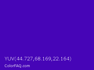 YUV 44.727,68.169,22.164 Color is a normal violet color and the nearest color is Interdimensional Blue #360ccc. Hex code #4605b7 and RGB value is rgb(70,5,183). In RGB color space, this color is composed of 27% red, 2% green, 72% blue, In CMYK color space, this color is composed of 62% cyan, 97% magenta, 0% yellow , 28% black , In HSL color space, this color has a hue angle of 262° , 95% saturation and 37% lightness.