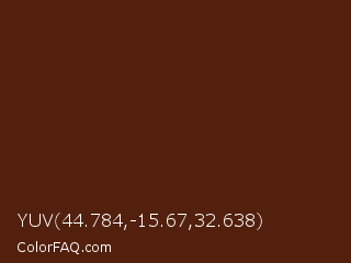 YUV 44.784,-15.67,32.638 Color is a very dark orange color and the nearest color is Cioccolato #55280c. Hex code #52200d and RGB value is rgb(82,32,13). In RGB color space, this color is composed of 32% red, 13% green, 5% blue, In CMYK color space, this color is composed of 0% cyan, 61% magenta, 84% yellow , 68% black , In HSL color space, this color has a hue angle of 17° , 73% saturation and 19% lightness.