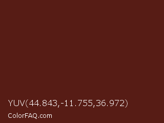 YUV 44.843,-11.755,36.972 Color is a very dark red color and the nearest color is Redwood #5d1e0f. Hex code #571c15 and RGB value is rgb(87,28,21). In RGB color space, this color is composed of 34% red, 11% green, 8% blue, In CMYK color space, this color is composed of 0% cyan, 68% magenta, 76% yellow , 66% black , In HSL color space, this color has a hue angle of 6° , 61% saturation and 21% lightness.