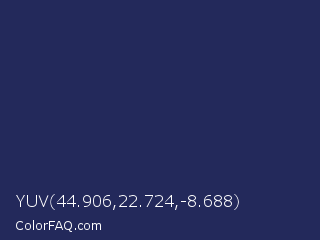 YUV 44.906,22.724,-8.688 Color is a dark blue color and the nearest color is Cloud Burst #202e54. Hex code #23295b and RGB value is rgb(35,41,91). In RGB color space, this color is composed of 14% red, 16% green, 36% blue, In CMYK color space, this color is composed of 62% cyan, 55% magenta, 0% yellow , 64% black , In HSL color space, this color has a hue angle of 234° , 44% saturation and 25% lightness.