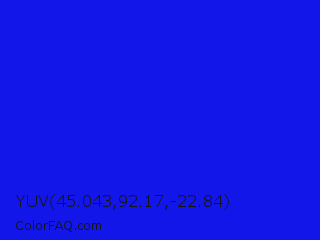 YUV 45.043,92.17,-22.84 Color is a normal blue color and the nearest color is Bluebonnet #1c1cf0. Hex code #1316e8 and RGB value is rgb(19,22,232). In RGB color space, this color is composed of 7% red, 9% green, 91% blue, In CMYK color space, this color is composed of 92% cyan, 91% magenta, 0% yellow , 9% black , In HSL color space, this color has a hue angle of 239° , 85% saturation and 49% lightness.
