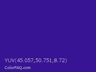 YUV 45.057,50.751,8.72 Color is a normal indigo color and the nearest color is Blue Gem #2c0e8c. Hex code #371494 and RGB value is rgb(55,20,148). In RGB color space, this color is composed of 22% red, 8% green, 58% blue, In CMYK color space, this color is composed of 63% cyan, 86% magenta, 0% yellow , 42% black , In HSL color space, this color has a hue angle of 256° , 76% saturation and 33% lightness.