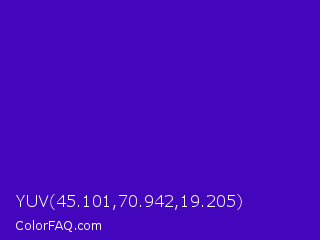 YUV 45.101,70.942,19.205 Color is a normal indigo color and the nearest color is Interdimensional Blue #360ccc. Hex code #4306bd and RGB value is rgb(67,6,189). In RGB color space, this color is composed of 26% red, 2% green, 74% blue, In CMYK color space, this color is composed of 65% cyan, 97% magenta, 0% yellow , 26% black , In HSL color space, this color has a hue angle of 260° , 94% saturation and 38% lightness.