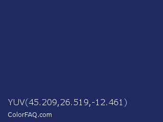 YUV 45.209,26.519,-12.461 Color is a dark blue color and the nearest color is Biscay #1b3162. Hex code #1f2a63 and RGB value is rgb(31,42,99). In RGB color space, this color is composed of 12% red, 16% green, 39% blue, In CMYK color space, this color is composed of 69% cyan, 58% magenta, 0% yellow , 61% black , In HSL color space, this color has a hue angle of 230° , 52% saturation and 25% lightness.