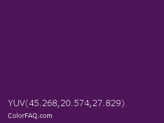 YUV 45.268,20.574,27.829 Color is a very dark purple color and the nearest color is Scarlet Gum #431560. Hex code #4d1557 and RGB value is rgb(77,21,87). In RGB color space, this color is composed of 30% red, 8% green, 34% blue, In CMYK color space, this color is composed of 11% cyan, 76% magenta, 0% yellow , 66% black , In HSL color space, this color has a hue angle of 291° , 61% saturation and 21% lightness.