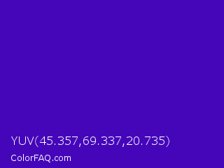 YUV 45.357,69.337,20.735 Color is a normal violet color and the nearest color is Interdimensional Blue #360ccc. Hex code #4506ba and RGB value is rgb(69,6,186). In RGB color space, this color is composed of 27% red, 2% green, 73% blue, In CMYK color space, this color is composed of 63% cyan, 97% magenta, 0% yellow , 27% black , In HSL color space, this color has a hue angle of 261° , 94% saturation and 38% lightness.