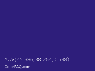 YUV 45.386,38.264,0.538 Color is a dark indigo color and the nearest color is Persian Indigo #32127a. Hex code #2e1e7b and RGB value is rgb(46,30,123). In RGB color space, this color is composed of 18% red, 12% green, 48% blue, In CMYK color space, this color is composed of 63% cyan, 76% magenta, 0% yellow , 52% black , In HSL color space, this color has a hue angle of 250° , 61% saturation and 30% lightness.