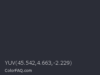 YUV 45.542,4.663,-2.229 Color is a very dark blue color and the nearest color is Charade #292937. Hex code #2b2d37 and RGB value is rgb(43,45,55). In RGB color space, this color is composed of 17% red, 18% green, 22% blue, In CMYK color space, this color is composed of 22% cyan, 18% magenta, 0% yellow , 78% black , In HSL color space, this color has a hue angle of 230° , 12% saturation and 19% lightness.