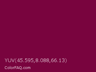YUV 45.595,8.088,66.13 Color is a dark rose color and the nearest color is Siren #7a013a. Hex code #79043e and RGB value is rgb(121,4,62). In RGB color space, this color is composed of 47% red, 2% green, 24% blue, In CMYK color space, this color is composed of 0% cyan, 97% magenta, 49% yellow , 53% black , In HSL color space, this color has a hue angle of 330° , 94% saturation and 25% lightness.