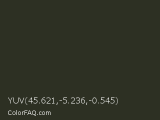 YUV 45.621,-5.236,-0.545 Color is a very dark lime color and the nearest color is Rangitoto #2e3222. Hex code #2d3023 and RGB value is rgb(45,48,35). In RGB color space, this color is composed of 18% red, 19% green, 14% blue, In CMYK color space, this color is composed of 6% cyan, 0% magenta, 27% yellow , 81% black , In HSL color space, this color has a hue angle of 74° , 16% saturation and 16% lightness.