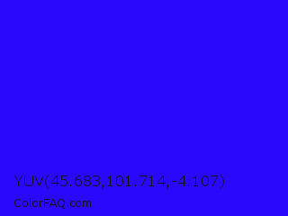 YUV 45.683,101.714,-4.107 Color is a normal indigo color and the nearest color is Electric Ultramarine #3f00ff. Hex code #2908fc and RGB value is rgb(41,8,252). In RGB color space, this color is composed of 16% red, 3% green, 99% blue, In CMYK color space, this color is composed of 84% cyan, 97% magenta, 0% yellow , 1% black , In HSL color space, this color has a hue angle of 248° , 98% saturation and 51% lightness.