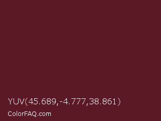 YUV 45.689,-4.777,38.861 Color is a dark red color and the nearest color is Caput Mortuum #592720. Hex code #5a1924 and RGB value is rgb(90,25,36). In RGB color space, this color is composed of 35% red, 10% green, 14% blue, In CMYK color space, this color is composed of 0% cyan, 72% magenta, 60% yellow , 65% black , In HSL color space, this color has a hue angle of 350° , 57% saturation and 23% lightness.