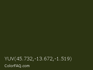 YUV 45.732,-13.672,-1.519 Color is a very dark lime color and the nearest color is Turtle Green #2a380b. Hex code #2c3412 and RGB value is rgb(44,52,18). In RGB color space, this color is composed of 17% red, 20% green, 7% blue, In CMYK color space, this color is composed of 15% cyan, 0% magenta, 65% yellow , 80% black , In HSL color space, this color has a hue angle of 74° , 49% saturation and 14% lightness.