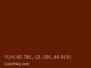 YUV 45.781,-21.091,44.919 Color is a very dark orange color and the nearest color is Redwood #5d1e0f. Hex code #611c03 and RGB value is rgb(97,28,3). In RGB color space, this color is composed of 38% red, 11% green, 1% blue, In CMYK color space, this color is composed of 0% cyan, 71% magenta, 97% yellow , 62% black , In HSL color space, this color has a hue angle of 16° , 94% saturation and 20% lightness.