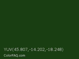 YUV 45.807,-14.202,-18.248 Color is a very dark green color and the nearest color is Palm Leaf #19330e. Hex code #193e11 and RGB value is rgb(25,62,17). In RGB color space, this color is composed of 10% red, 24% green, 7% blue, In CMYK color space, this color is composed of 60% cyan, 0% magenta, 73% yellow , 76% black , In HSL color space, this color has a hue angle of 109° , 57% saturation and 15% lightness.