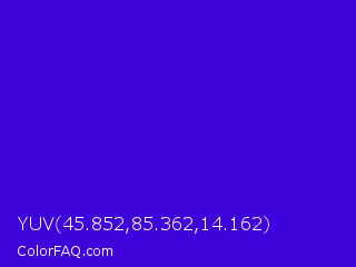 YUV 45.852,85.362,14.162 Color is a normal indigo color and the nearest color is Interdimensional Blue #360ccc. Hex code #3e04db and RGB value is rgb(62,4,219). In RGB color space, this color is composed of 24% red, 2% green, 86% blue, In CMYK color space, this color is composed of 72% cyan, 98% magenta, 0% yellow , 14% black , In HSL color space, this color has a hue angle of 256° , 96% saturation and 44% lightness.