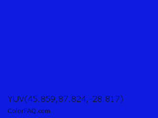 YUV 45.859,87.824,-28.817 Color is a normal blue color and the nearest color is Bluebonnet #1c1cf0. Hex code #0d1ce0 and RGB value is rgb(13,28,224). In RGB color space, this color is composed of 5% red, 11% green, 88% blue, In CMYK color space, this color is composed of 94% cyan, 88% magenta, 0% yellow , 12% black , In HSL color space, this color has a hue angle of 236° , 89% saturation and 46% lightness.