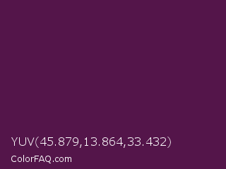 YUV 45.879,13.864,33.432 Color is a very dark magenta color and the nearest color is Loulou #460b41. Hex code #54154a and RGB value is rgb(84,21,74). In RGB color space, this color is composed of 33% red, 8% green, 29% blue, In CMYK color space, this color is composed of 0% cyan, 75% magenta, 12% yellow , 67% black , In HSL color space, this color has a hue angle of 310° , 60% saturation and 21% lightness.