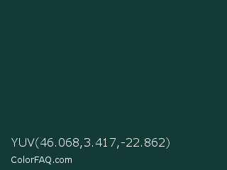 YUV 46.068,3.417,-22.862 Color is a very dark cyan color and the nearest color is Gable Green #163531. Hex code #143a35 and RGB value is rgb(20,58,53). In RGB color space, this color is composed of 8% red, 23% green, 21% blue, In CMYK color space, this color is composed of 66% cyan, 0% magenta, 9% yellow , 77% black , In HSL color space, this color has a hue angle of 172° , 49% saturation and 15% lightness.