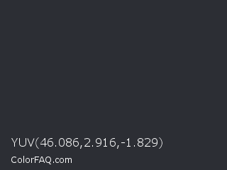 YUV 46.086,2.916,-1.829 Color is a very dark blue color and the nearest color is Charade #292937. Hex code #2c2e34 and RGB value is rgb(44,46,52). In RGB color space, this color is composed of 17% red, 18% green, 20% blue, In CMYK color space, this color is composed of 15% cyan, 12% magenta, 0% yellow , 80% black , In HSL color space, this color has a hue angle of 225° , 8% saturation and 19% lightness.