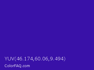 YUV 46.174,60.06,9.494 Color is a normal indigo color and the nearest color is Blue Gem #2c0e8c. Hex code #3911a8 and RGB value is rgb(57,17,168). In RGB color space, this color is composed of 22% red, 7% green, 66% blue, In CMYK color space, this color is composed of 66% cyan, 90% magenta, 0% yellow , 34% black , In HSL color space, this color has a hue angle of 256° , 82% saturation and 36% lightness.