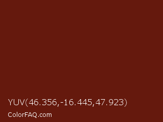 YUV 46.356,-16.445,47.923 Color is a very dark red color and the nearest color is Cherrywood #651a14. Hex code #65190d and RGB value is rgb(101,25,13). In RGB color space, this color is composed of 40% red, 10% green, 5% blue, In CMYK color space, this color is composed of 0% cyan, 75% magenta, 87% yellow , 60% black , In HSL color space, this color has a hue angle of 8° , 77% saturation and 22% lightness.