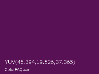 YUV 46.394,19.526,37.365 Color is a very dark magenta color and the nearest color is Clairvoyant #480656. Hex code #591156 and RGB value is rgb(89,17,86). In RGB color space, this color is composed of 35% red, 7% green, 34% blue, In CMYK color space, this color is composed of 0% cyan, 81% magenta, 3% yellow , 65% black , In HSL color space, this color has a hue angle of 303° , 68% saturation and 21% lightness.