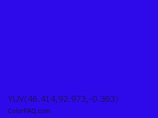 YUV 46.414,92.973,-0.363 Color is a normal indigo color and the nearest color is Bluebonnet #1c1cf0. Hex code #2e0aeb and RGB value is rgb(46,10,235). In RGB color space, this color is composed of 18% red, 4% green, 92% blue, In CMYK color space, this color is composed of 80% cyan, 96% magenta, 0% yellow , 8% black , In HSL color space, this color has a hue angle of 250° , 92% saturation and 48% lightness.