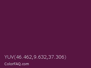 YUV 46.462,9.632,37.306 Color is a very dark magenta color and the nearest color is Wine Berry #591d35. Hex code #591542 and RGB value is rgb(89,21,66). In RGB color space, this color is composed of 35% red, 8% green, 26% blue, In CMYK color space, this color is composed of 0% cyan, 76% magenta, 26% yellow , 65% black , In HSL color space, this color has a hue angle of 320° , 62% saturation and 22% lightness.