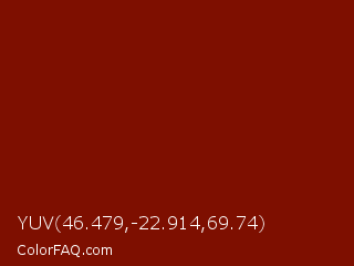 YUV 46.479,-22.914,69.74 Color is a dark red color and the nearest color is Barn Red #7c0a02. Hex code #7e0f00 and RGB value is rgb(126,15,-0). In RGB color space, this color is composed of 49% red, 6% green, 0% blue, In CMYK color space, this color is composed of 0% cyan, 88% magenta, 100% yellow , 51% black , In HSL color space, this color has a hue angle of 7° , 100% saturation and 25% lightness.