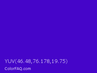 YUV 46.48,76.178,19.75 Color is a normal indigo color and the nearest color is Interdimensional Blue #360ccc. Hex code #4505c9 and RGB value is rgb(69,5,201). In RGB color space, this color is composed of 27% red, 2% green, 79% blue, In CMYK color space, this color is composed of 66% cyan, 98% magenta, 0% yellow , 21% black , In HSL color space, this color has a hue angle of 260° , 95% saturation and 40% lightness.
