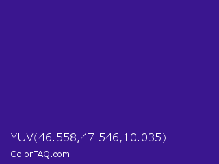 YUV 46.558,47.546,10.035 Color is a normal indigo color and the nearest color is Pixie Powder #391285. Hex code #3a168f and RGB value is rgb(58,22,143). In RGB color space, this color is composed of 23% red, 9% green, 56% blue, In CMYK color space, this color is composed of 59% cyan, 85% magenta, 0% yellow , 44% black , In HSL color space, this color has a hue angle of 258° , 73% saturation and 32% lightness.