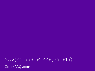 YUV 46.558,54.448,36.345 Color is a normal purple color and the nearest color is Purple #660099. Hex code #58049d and RGB value is rgb(88,4,157). In RGB color space, this color is composed of 35% red, 2% green, 62% blue, In CMYK color space, this color is composed of 44% cyan, 97% magenta, 0% yellow , 38% black , In HSL color space, this color has a hue angle of 273° , 95% saturation and 32% lightness.