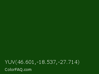 YUV 46.601,-18.537,-27.714 Color is a very dark green color and the nearest color is Dark Fern #0a480d. Hex code #0f4609 and RGB value is rgb(15,70,9). In RGB color space, this color is composed of 6% red, 27% green, 4% blue, In CMYK color space, this color is composed of 79% cyan, 0% magenta, 87% yellow , 73% black , In HSL color space, this color has a hue angle of 114° , 77% saturation and 15% lightness.
