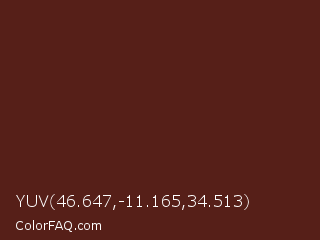 YUV 46.647,-11.165,34.513 Color is a very dark red color and the nearest color is Redwood #5d1e0f. Hex code #561f18 and RGB value is rgb(86,31,24). In RGB color space, this color is composed of 34% red, 12% green, 9% blue, In CMYK color space, this color is composed of 0% cyan, 64% magenta, 72% yellow , 66% black , In HSL color space, this color has a hue angle of 7° , 56% saturation and 22% lightness.