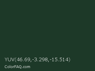 YUV 46.69,-3.298,-15.514 Color is a very dark green color and the nearest color is Medium Jungle Green #1c352d. Hex code #1d3928 and RGB value is rgb(29,57,40). In RGB color space, this color is composed of 11% red, 22% green, 16% blue, In CMYK color space, this color is composed of 49% cyan, 0% magenta, 30% yellow , 78% black , In HSL color space, this color has a hue angle of 144° , 33% saturation and 17% lightness.