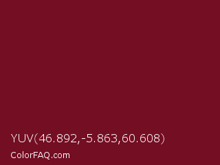 YUV 46.892,-5.863,60.608 Color is a dark red color and the nearest color is Persian Plum #701c1c. Hex code #740e23 and RGB value is rgb(116,14,35). In RGB color space, this color is composed of 45% red, 5% green, 14% blue, In CMYK color space, this color is composed of 0% cyan, 88% magenta, 70% yellow , 55% black , In HSL color space, this color has a hue angle of 348° , 78% saturation and 25% lightness.