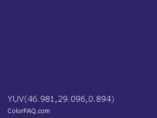 YUV 46.981,29.096,0.894 Color is a dark indigo color and the nearest color is Jacarta #3a2a6a. Hex code #30236a and RGB value is rgb(48,35,106). In RGB color space, this color is composed of 19% red, 14% green, 42% blue, In CMYK color space, this color is composed of 55% cyan, 67% magenta, 0% yellow , 58% black , In HSL color space, this color has a hue angle of 251° , 50% saturation and 28% lightness.