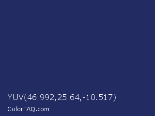 YUV 46.992,25.64,-10.517 Color is a dark blue color and the nearest color is Biscay #1b3162. Hex code #232b63 and RGB value is rgb(35,43,99). In RGB color space, this color is composed of 14% red, 17% green, 39% blue, In CMYK color space, this color is composed of 65% cyan, 57% magenta, 0% yellow , 61% black , In HSL color space, this color has a hue angle of 233° , 48% saturation and 26% lightness.