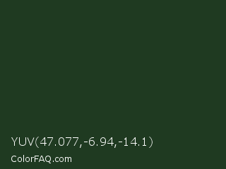 YUV 47.077,-6.94,-14.1 Color is a very dark green color and the nearest color is Black Leather Jacket #253529. Hex code #1f3a21 and RGB value is rgb(31,58,33). In RGB color space, this color is composed of 12% red, 23% green, 13% blue, In CMYK color space, this color is composed of 47% cyan, 0% magenta, 43% yellow , 77% black , In HSL color space, this color has a hue angle of 124° , 30% saturation and 17% lightness.