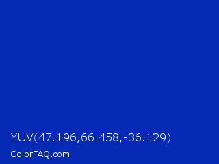 YUV 47.196,66.458,-36.129 Color is a normal blue color and the nearest color is UA Blue #0033aa. Hex code #062ab6 and RGB value is rgb(6,42,182). In RGB color space, this color is composed of 2% red, 16% green, 71% blue, In CMYK color space, this color is composed of 97% cyan, 77% magenta, 0% yellow , 29% black , In HSL color space, this color has a hue angle of 228° , 94% saturation and 37% lightness.