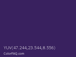 YUV 47.244,23.544,8.556 Color is a dark violet color and the nearest color is Jacarta #3a2a6a. Hex code #39215f and RGB value is rgb(57,33,95). In RGB color space, this color is composed of 22% red, 13% green, 37% blue, In CMYK color space, this color is composed of 40% cyan, 65% magenta, 0% yellow , 63% black , In HSL color space, this color has a hue angle of 263° , 48% saturation and 25% lightness.