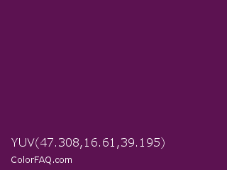 YUV 47.308,16.61,39.195 Color is a very dark magenta color and the nearest color is Pompadour #660045. Hex code #5c1251 and RGB value is rgb(92,18,81). In RGB color space, this color is composed of 36% red, 7% green, 32% blue, In CMYK color space, this color is composed of 0% cyan, 80% magenta, 12% yellow , 64% black , In HSL color space, this color has a hue angle of 309° , 67% saturation and 22% lightness.