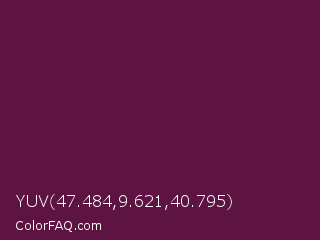 YUV 47.484,9.621,40.795 Color is a very dark magenta color and the nearest color is Wine Berry #591d35. Hex code #5e1443 and RGB value is rgb(94,20,67). In RGB color space, this color is composed of 37% red, 8% green, 26% blue, In CMYK color space, this color is composed of 0% cyan, 79% magenta, 29% yellow , 63% black , In HSL color space, this color has a hue angle of 322° , 65% saturation and 22% lightness.