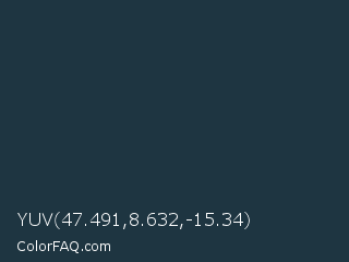 YUV 47.491,8.632,-15.34 Color is a very dark blue color and the nearest color is Yankees Blue #1c2841. Hex code #1e3541 and RGB value is rgb(30,53,65). In RGB color space, this color is composed of 12% red, 21% green, 25% blue, In CMYK color space, this color is composed of 54% cyan, 18% magenta, 0% yellow , 75% black , In HSL color space, this color has a hue angle of 201° , 37% saturation and 19% lightness.
