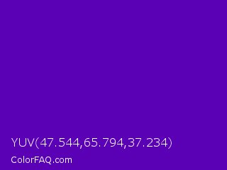 YUV 47.544,65.794,37.234 Color is a normal violet color and the nearest color is Purple #660099. Hex code #5a00b5 and RGB value is rgb(90,-0,181). In RGB color space, this color is composed of 35% red, 0% green, 71% blue, In CMYK color space, this color is composed of 50% cyan, 100% magenta, 0% yellow , 29% black , In HSL color space, this color has a hue angle of 270° , 100% saturation and 35% lightness.