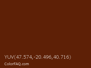 YUV 47.574,-20.496,40.716 Color is a very dark orange color and the nearest color is Seal Brown #59260b. Hex code #5e2006 and RGB value is rgb(94,32,6). In RGB color space, this color is composed of 37% red, 13% green, 2% blue, In CMYK color space, this color is composed of 0% cyan, 66% magenta, 94% yellow , 63% black , In HSL color space, this color has a hue angle of 18° , 88% saturation and 20% lightness.