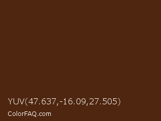 YUV 47.637,-16.09,27.505 Color is a very dark orange color and the nearest color is Cioccolato #55280c. Hex code #4f260f and RGB value is rgb(79,38,15). In RGB color space, this color is composed of 31% red, 15% green, 6% blue, In CMYK color space, this color is composed of 0% cyan, 52% magenta, 81% yellow , 69% black , In HSL color space, this color has a hue angle of 22° , 68% saturation and 18% lightness.